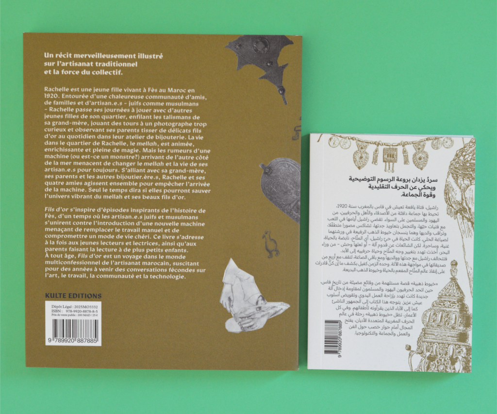 L’ouvrage Fils d’or écrit par Ariella Aïsha Azoulay est un livre qui s’adresse à la fois aux jeunes lecteurs et lectrices, ainsi qu’aux plus grands. Le récit, merveilleusement illustré par Hagar Ophir, s’inspire d’un temps où les artisan.es juifs et musulmans de Fès s’unirent pour protéger leur communauté vivant au sein du mellah, le quartier juif. Une histoire sur l’artisanat traditionnel et la force du collectif, pour raviver la mémoire d’un monde perdu.